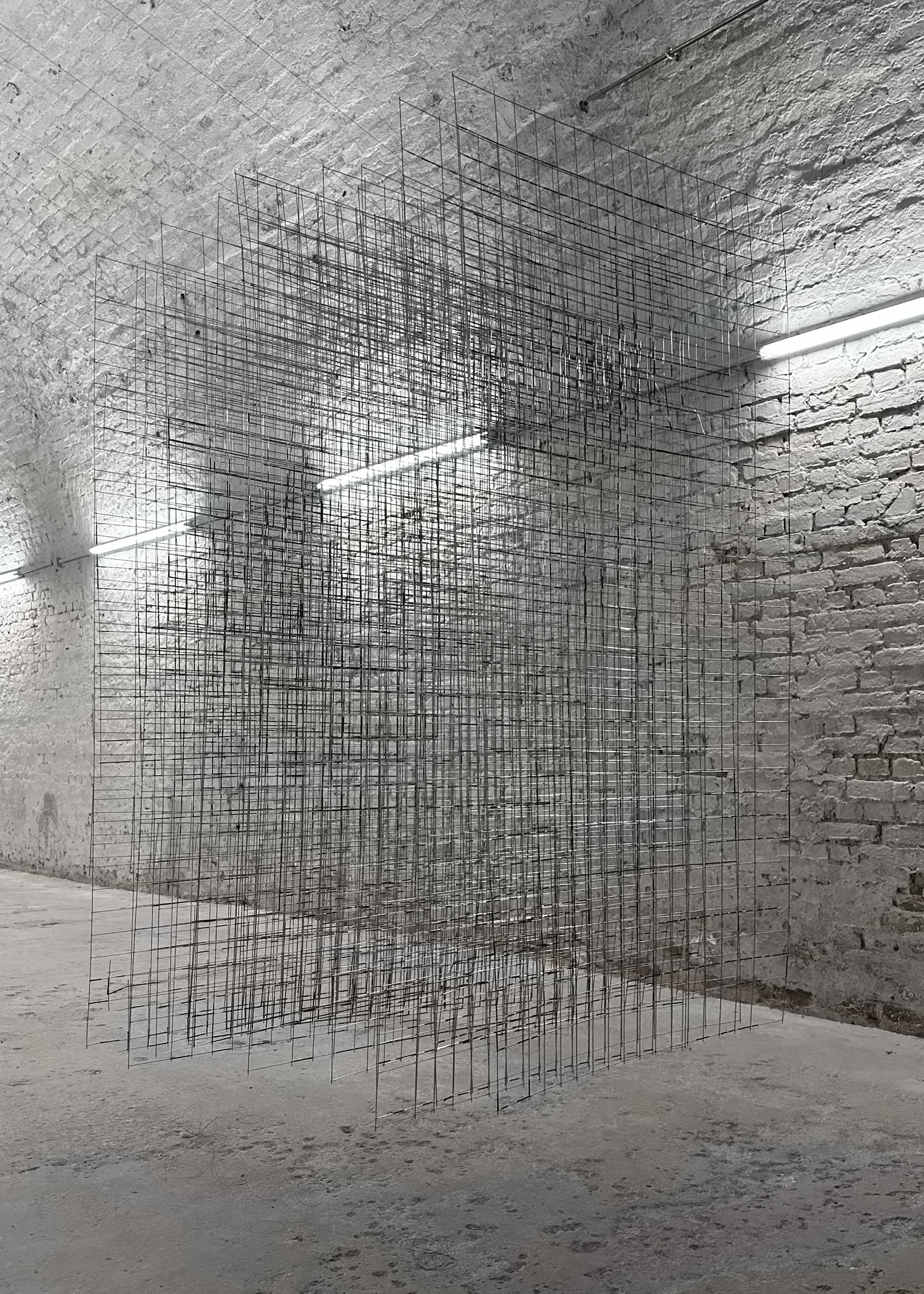 2024 Raumzeichnung mit Metallgittern und Metallstrings. Ausstellungsansicht "Identity", Glue Berlin. Foto: Hans-Georg Gaul.