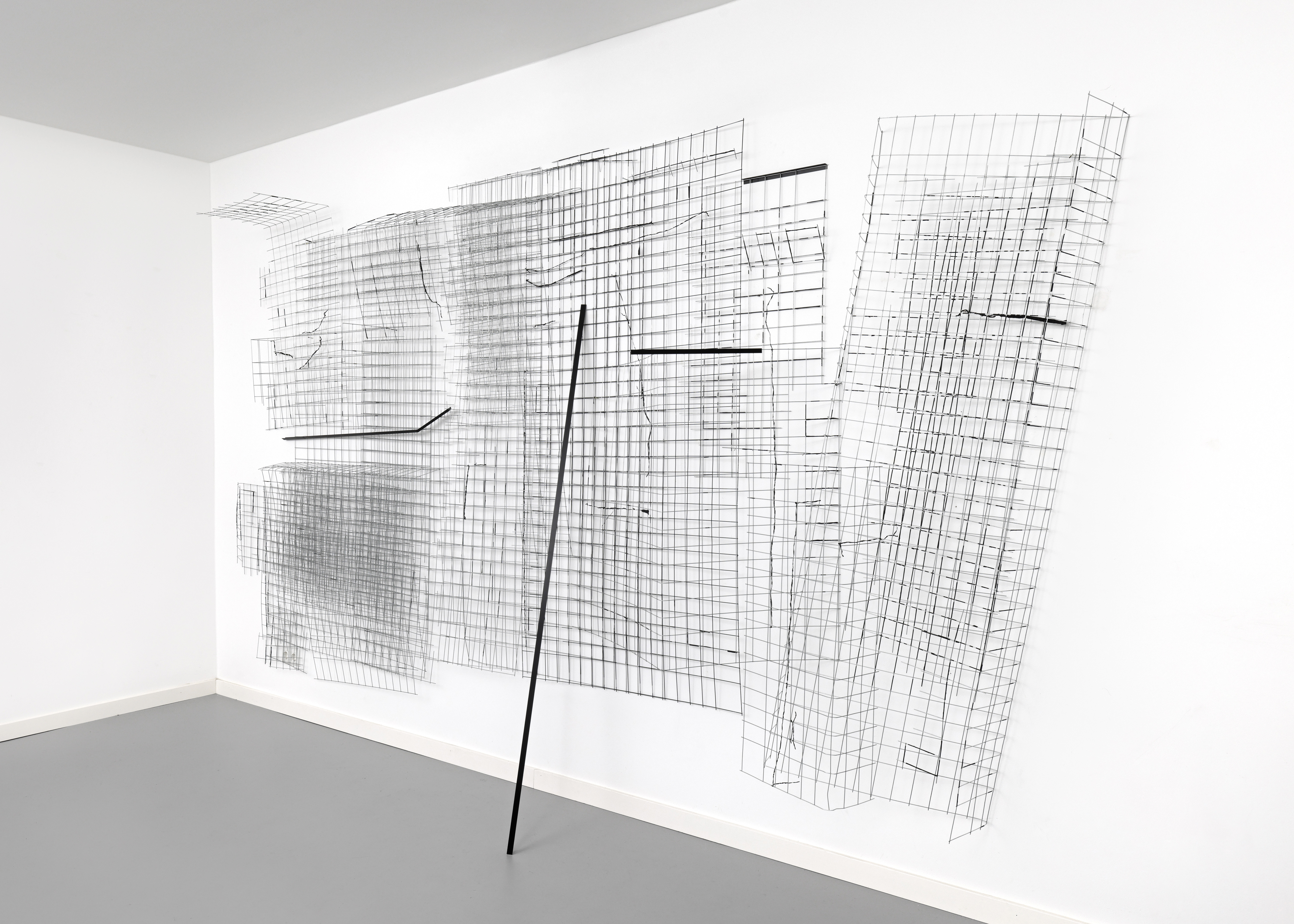 2024, Zeichnung mit Metallgittern, -strings und -stangen. Installstionsansicht "Collapsing Orders", Odalisque Berlin.