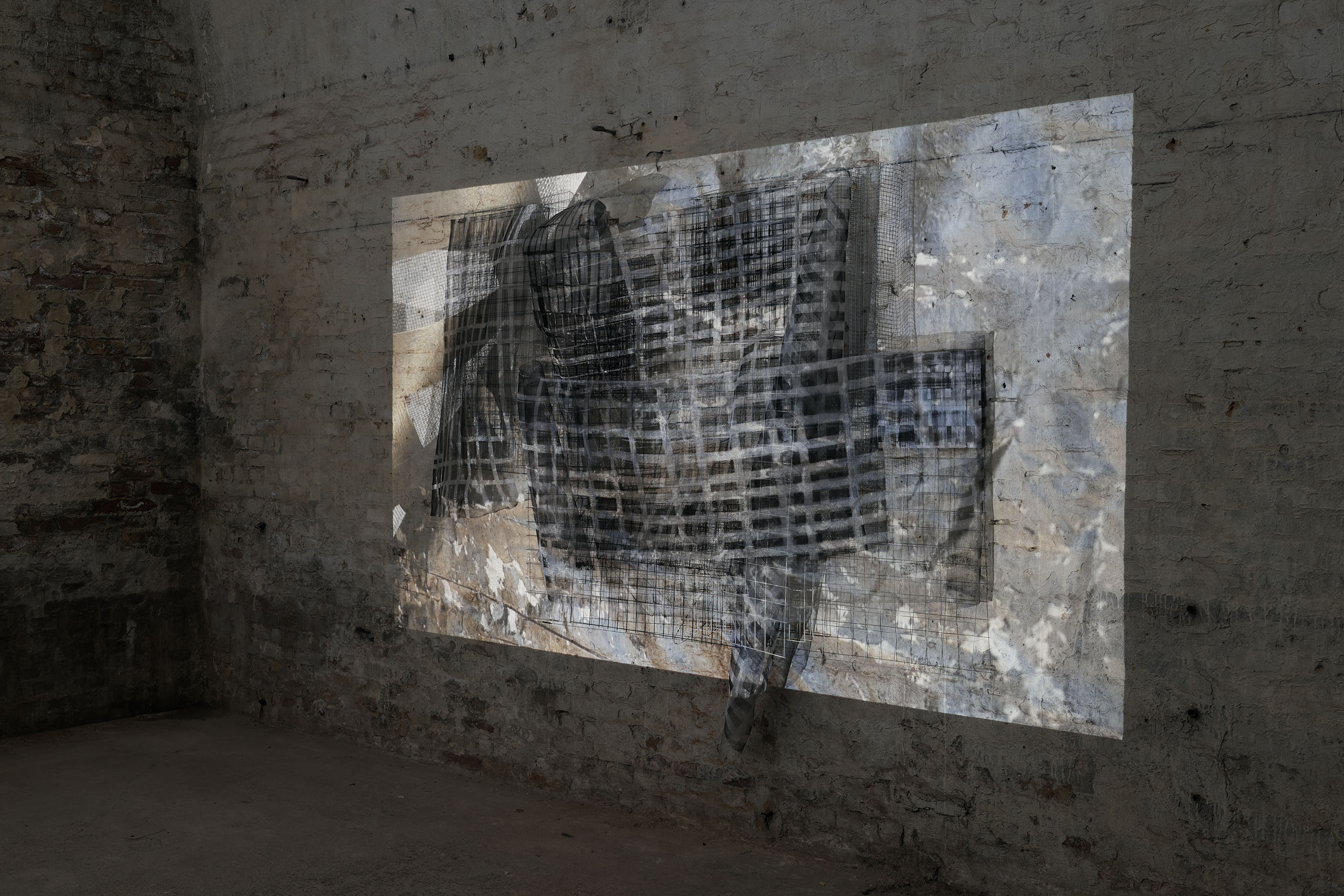 2025, Metallgaze, Metallgitter, Acryl, Video FHD 6:00min, ca 210x340x60cm. Ausstellungsansicht Glue Berlin. Foto:Hans-Georg Gaul.