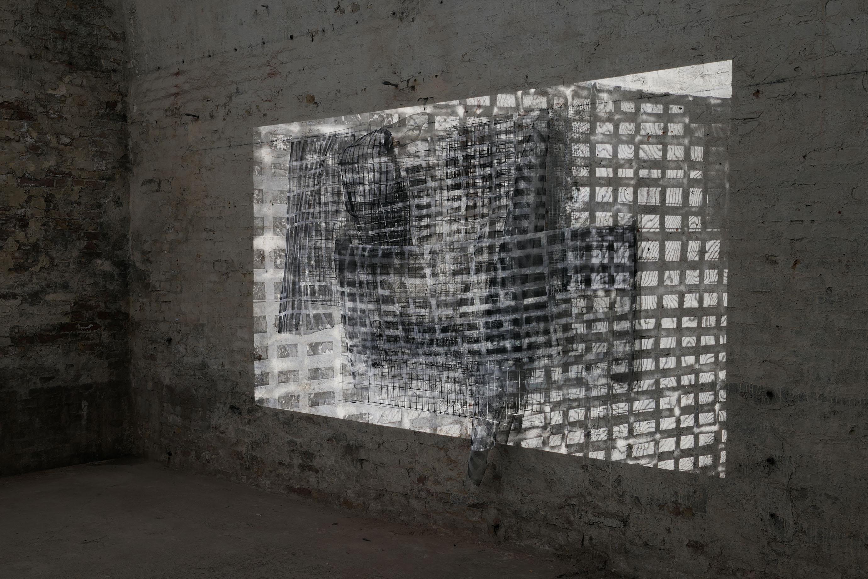 2025, Metallgaze, Metallgitter, Acryl, Video FHD 6:00min, ca 210x340x60cm. Ausstellungsansicht Glue Berlin. Foto:Hans-Georg Gaul.