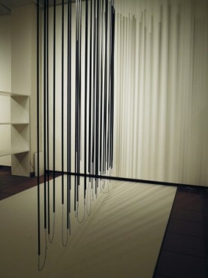 2018, Raumzeichnung mit Metallstangen, Gummi, Tape, 600 x 252 x 360 cm. Galerie im Körnerpark.