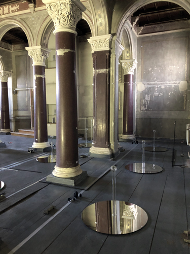2017, Raumzeichnung mit Spiegeln, Glas, Tape, Metallstangen. Schlosskapelle Weimar.
