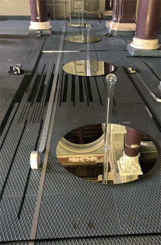 2017, Raumzeichnung mit Spiegeln, Glas, Tape, Metallstangen. Schlosskapelle Weimar.