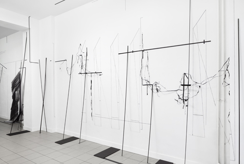 2016, Raumzeichnung mit Tape, Holz, Jalousien, Metallstrings, Ausstellungsansicht.