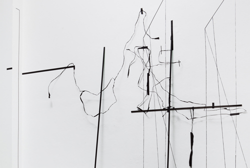 2016, Raumzeichnung mit Tape, Holz, Jalousien, Metallstrings, Ausstellungsansicht.